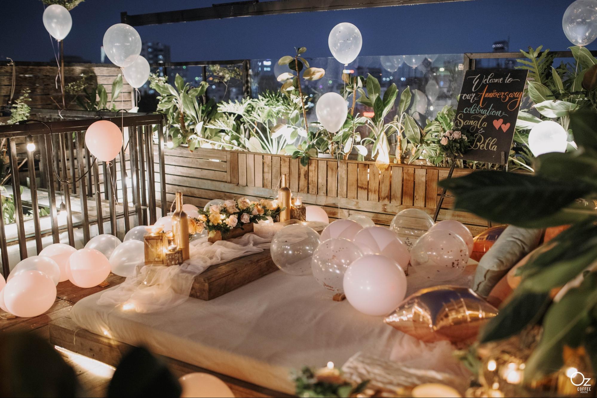 Đặc biệt hơn cả, OZ Coffee House nổi tiếng với ý tưởng hẹn hò độc đáo: ngồi trên giường cao ngắm view thành phố. Ngoài cây xanh bao quanh cùng hồ bơi mát mắt, các cặp tình nhân có thể hẹn hò trên chiếc giường đầy hoa và bong bóng được đặt ở sân thượng, vừa ăn tối ấm cúng, vừa ngắm trọn thành phố khi đèn lên.