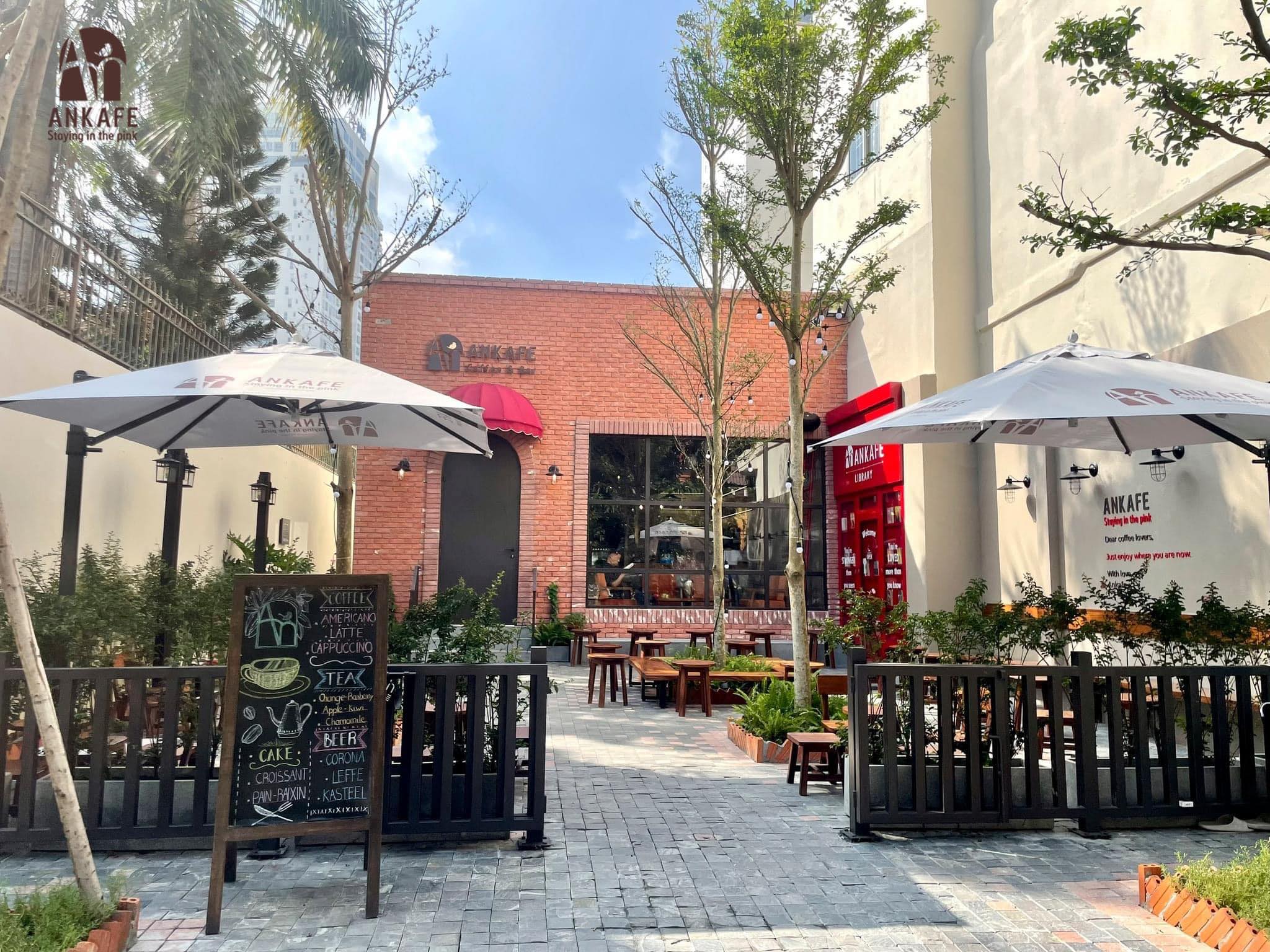 AnKafe có không gian được chia làm 2 với phần mở và kín. Khuôn viên bên ngoài được thiết kế một cách tinh tế với những khóm hoa tường vy nhẹ đung đưa trong gió. Loài hoa có cánh mỏng manh, bông hoa được trời phú cho màu hồng nhẹ nhàng, kết hợp cùng mảng tường kiên cố là điểm tựa chắc chắn giúp nàng hoa thỏa sức nghiêng mình chào đón khách đến tham quan quán.