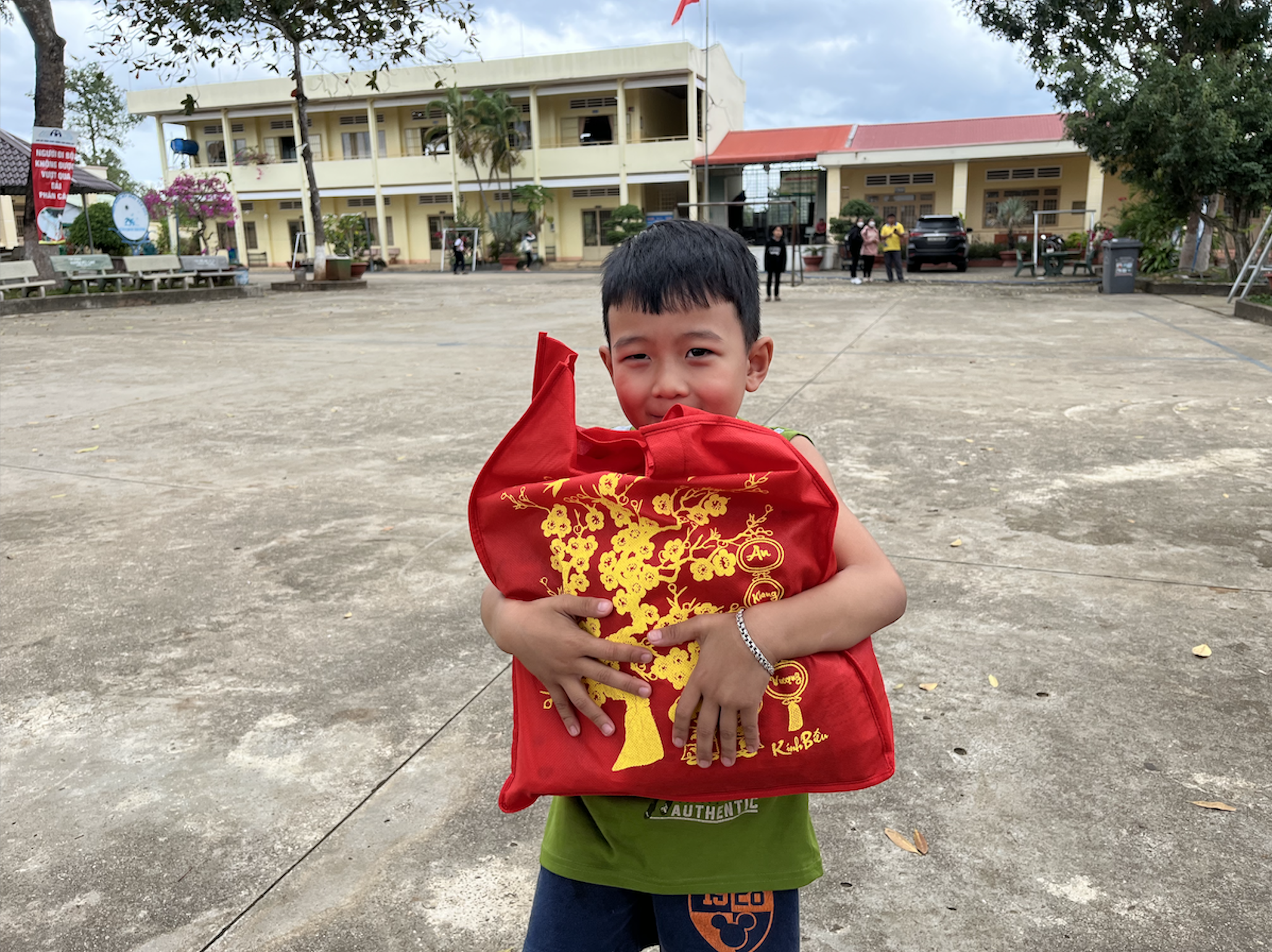 Em Nguyễn Băng Phúc, lớp 1a1, trường tiểu học Lâm San không giấu được niềm vui khi ôm chặt túi quà trong tay cùng khuôn mặt hớn hở chạy tung tăng khắp sân trường.