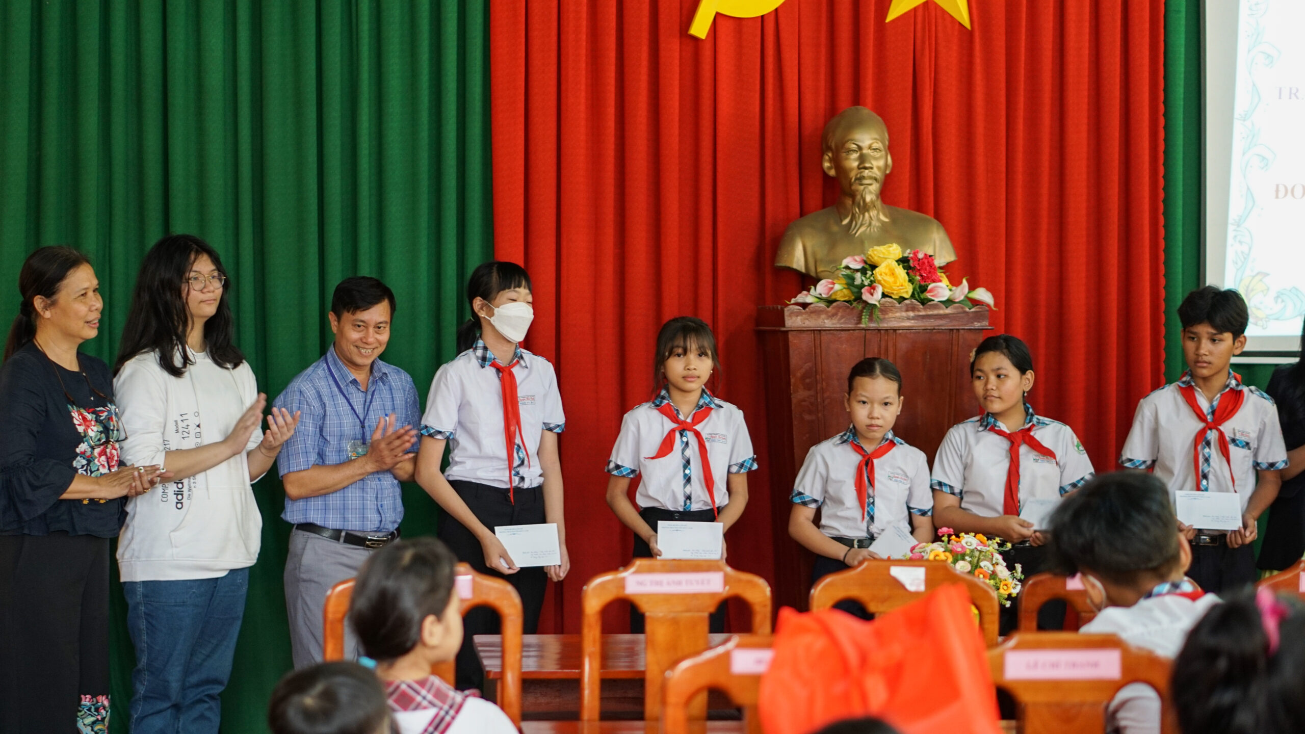 Bên cạnh đó, đại diện trang Sống Đẹp TV, bà Lý Thị Toàn Thắng trao thêm 5 suất học bổng “Khuyến học khuyến tài” đến 5 em học sinh đồng bào thiểu số học khá, giỏi và xuất sắc tại trường THCS Nguyễn Hữu Cảnh.