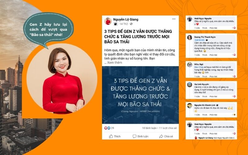 Trên một group cộng đồng lớn của Gen Z, chị Nguyễn Lệ Giang, HR tại Decathlon Việt Nam đã có bài chia sẻ về “3 tips để Gen Z vẫn được thăng chức & tăng lương trước mọi bão sa thải”. Theo chị, có 3 cách để vượt bão, đó là tập trung vào giá trị mà bạn đóng góp, không ngừng mở rộng phạm vi trách nhiệm công việc và tạo sự ảnh hưởng tích cực đến người khác.