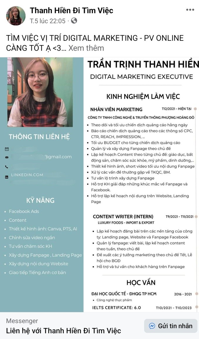 Điển hình như cô nàng Trần Trịnh Thanh Hiền (SN 1998, Thanh Hóa) – một Gen Z đời đầu đã lập hẳn một fanpage để chạy quảng cáo cho CV của mình để tiếp cận với nhà tuyển dụng thay vì tìm job, nộp CV như lẽ thường. Điều “độc lạ” này không chỉ mau chóng gây sốt trong cộng đồng Gen Z mà còn tạo sự thích thú, ấn tượng cho nhà tuyển dụng và nhiều người khác trong lĩnh vực Marketing – Truyền thông