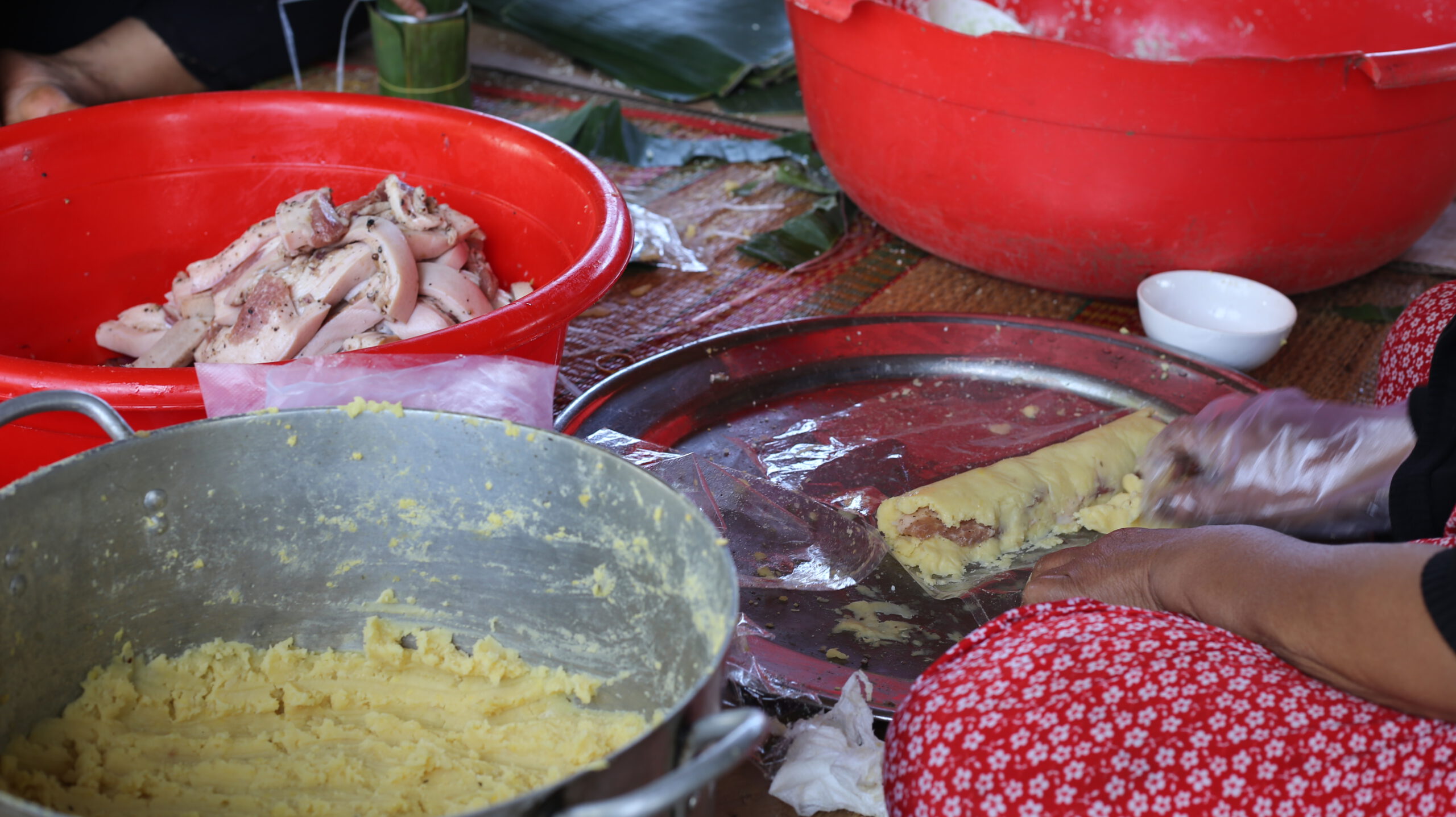 Khi nguyên liệu đã chuẩn bị đầy đủ, mọi người bắt tay vào việc gói bánh, ông bà cùng cô chú, những người có kinh nghiệm gói bánh sẽ đảm đương công việc này. Tôi thấy ông lấy những chiếc lá chuối xếp vuông góc với nhau, 2 lá có mặt phải úp xuống và 2 lá có mặt phải ngửa lên. Tiếp theo, ông lấy chén nếp nhỏ đổ lên trên mặt lá đã xếp sẵn, tiếp là cho vào giữa 1 vá đậu xanh, một vài lát thịt vào chính giữa, một lớp đậu xanh nữa và cuối cùng là thêm một lớp nếp phủ kín phần nhân. Sau đó ông nắm hết hai mép lá chuối rồi gấp đôi lại, cuộn tròn hơi chặt tay để bánh được chắc. Ông lấy 1 sợi dây lạt ở phần giữa bánh để giữ cố định rồi tiếp tục gấp lá chuối lại cột bên trên và bên dưới bánh đều nhau, cho ra hình trụ tròn vô cùng xinh xắn.