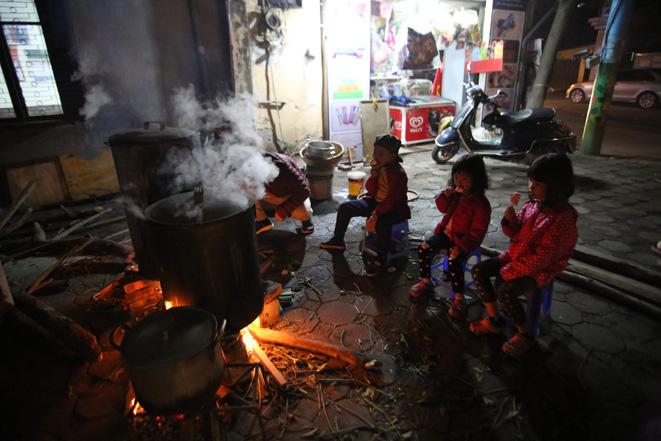 Nấu bánh tét cho đến khi chín mềm bên tròng thì phải mất hơn một ngày, vì thế nó thường kéo dài qua đêm. Bố tôi là người phụ trách chính trong việc nấu bánh, thế nên tôi đã xung phong cùng bố thức trắng đêm để canh nồi bánh. Cứ cách một hai tiếng, bố lại lấy thêm nước chêm vào nồi, điều chỉnh ngọn lửa sao cho vừa phải để bánh chín đều. Tôi nhìn xung quanh, xa xa thấy nhiều nhà cũng đang quây quần bên bếp lửa và nồi bánh chưng, cảm giác thật bồi hồi và ấm áp làm sao.