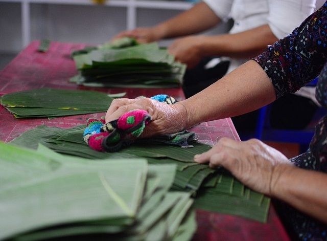 Mọi người cùng theo ông gói từng chiếc bánh, tay ai cũng đều thoăn thoắt, chẳng mấy chốc mà đã gói được vài chục cái. Ảnh Thùy Dương.